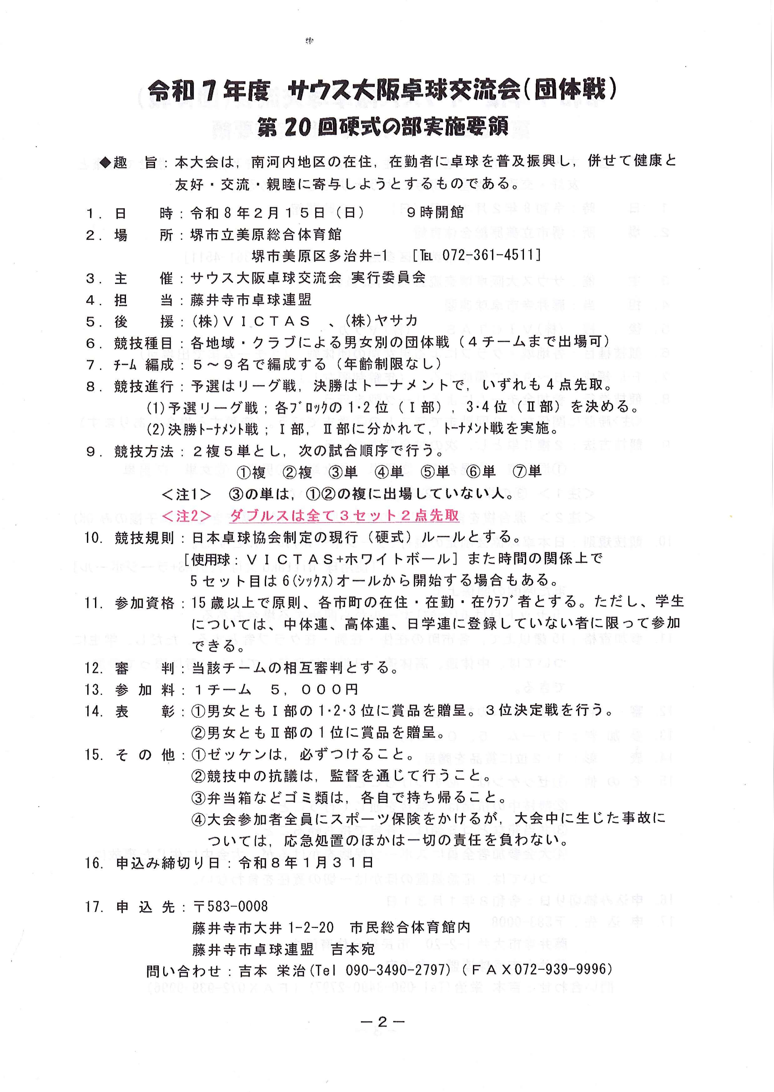 R7年度第20回サウス大阪卓球交流会地域・クラブチーム大会の詳細