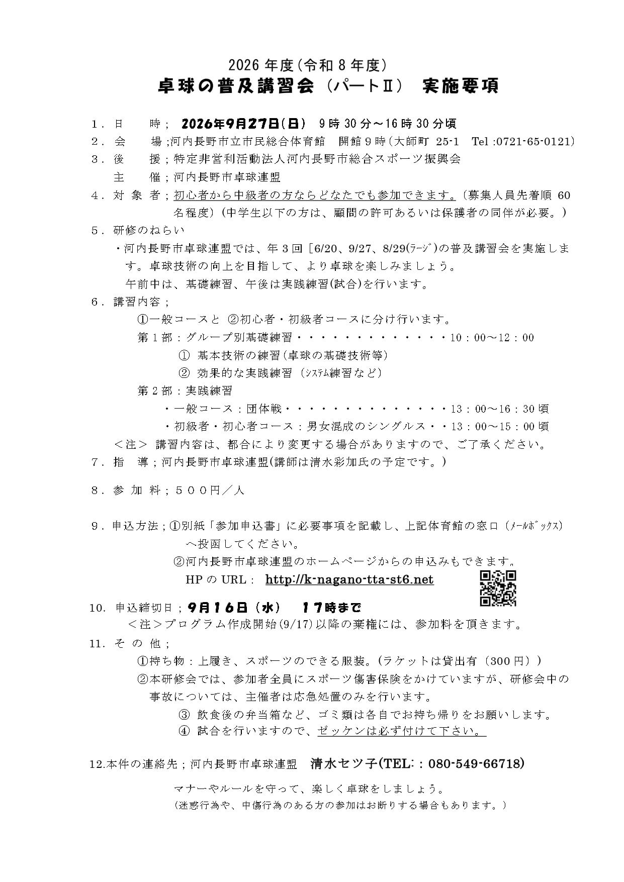 ➄R8卓球の普及講習会(パートⅡ)の実施要項